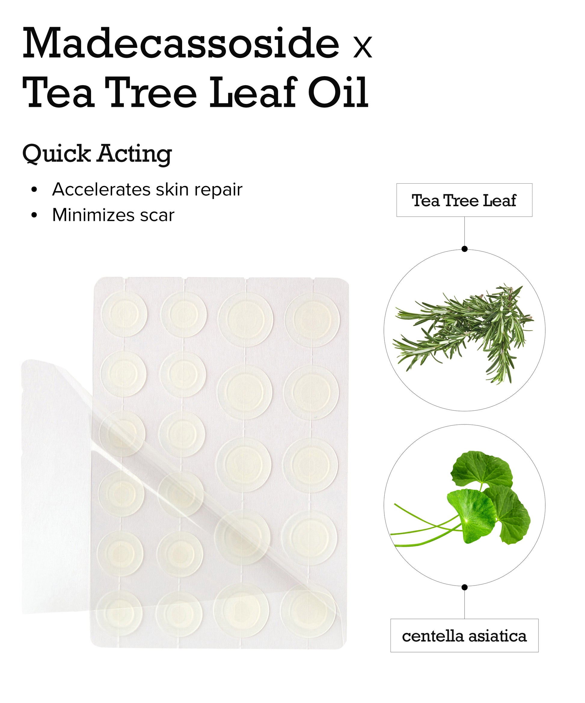 Experience faster, clearer skin with our advanced hydrocolloid acne patches. With 700% absorption rate, these patches accelerate the healing process, speeding up recovery seven times faster for visibly smoother results. The ultra-thin, transparent design seamlessly blends with all skin tones, offering discreet, undetectable coverage. Infused with Madecassoside and Tea Tree Leaf Extract, these patches help calm irritated skin, reduce inflammation, control excess oil, and target acne-causing factors, restoring a balanced complexion. Hydrocolloid technology absorbs impurities and creates a moist healing environment, while waterproof and sweatproof adhesion ensures the patch stays in place through water, sweat, and makeup. Convenient perforated sheets make for easy, hygienic application, ensuring a clean, simple experience every time.